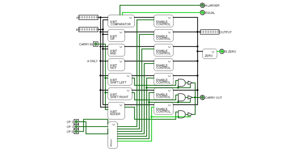 Opcodes, meaning operation codes, are used to instruct the ALU to perform a specific arithmetic or bitwise operation. In my implementation of the ALU, the opcode size is 3 bits, and a 3x8 binary decoder is used to map the opcode input into its respective operation.
