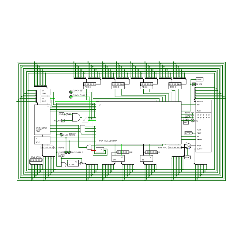 The control section is where all of the control logic resides. While not directly connected to the data bus, the control section is connected to every component, enabling and setting them according to the current instruction. To interpret 8-bits of instruction into physical processes is the remarkable job of this component. The outputs of the control section include the enable and set signals for all of the CPU’s components The inputs of the control section include the clocks, the load pin, the ALU flag (status) register output, a reset pin, the MAR set pin, and most importantly, the instruction itself.