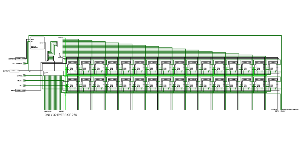 The Random Access Memory (RAM) was the most satisfying to build. Scalable to 256 bytes, I only implemented 32 bytes for simplicity and efficiency. Each block of memory is a 1 byte (8-bit) register.